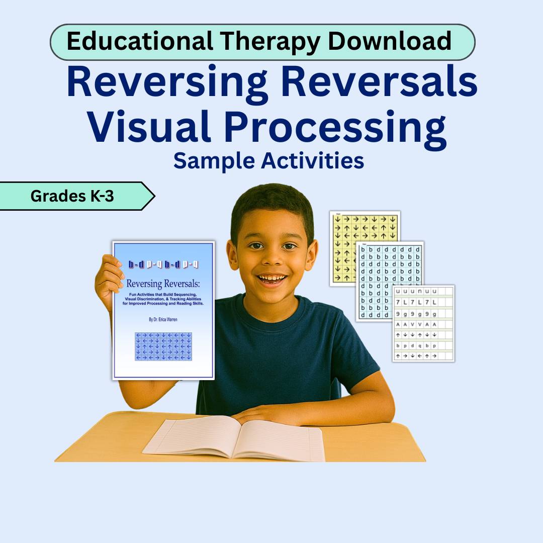 This printable sample from the Reversing Reversals series includes fun, cognitive exercises like letter tracking (slash the b's), p/q mazes, symbol discrimination coloring activities (color to reveal), and direction mazes (Left/Right/Up/Down paths). Designed to strengthen visual discrimination, sequencing, and tracking, no prep is needed!